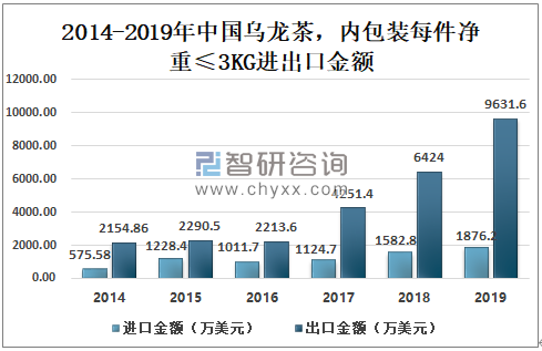 2018年中国内包装每件净重≤3KG的乌龙茶进口金额为1582.8万美元,出口金额为6424万美元;2019年中国内包装每件净重≤3KG的乌龙茶进口金额为1876.2万美元,出口金额为9631.6万美元。