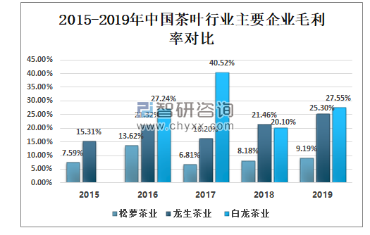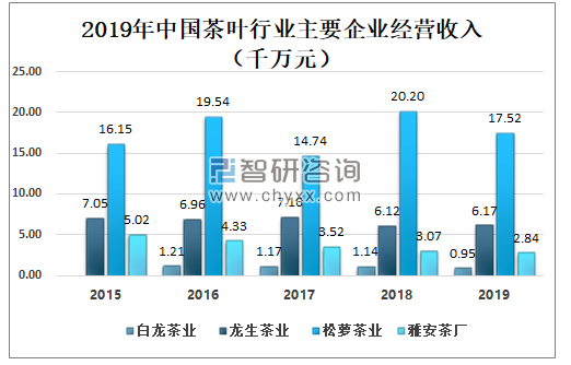 白龙茶业、龙生茶业、松萝茶业和雅安茶厂等企业为中国茶叶行业龙头,2019年白龙茶业、龙生茶业、松萝茶业和雅安茶厂经营收入分别为0.95千万元、6.17千万元、17.52千万元、2.84千万元。2019年中国白龙茶业、龙生茶业、松萝茶业毛利率分别为27.55%、25.30%、9.19%。