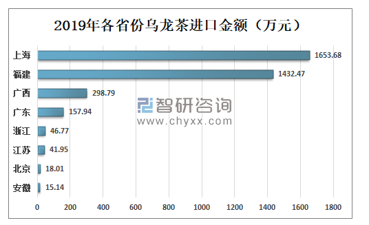 2019年中国乌龙茶进口金额排名第一的地区是上海市,进口金额为1653.68万元;福建省排名第二,进口数量为1432.47万元;广西、广东省进口金额分别是298.79吨、157.94吨,全国排名第三、第四。