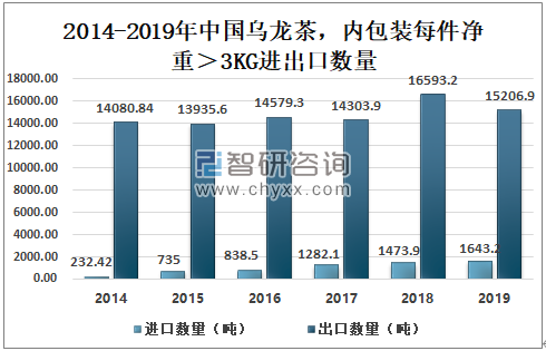 2014-2019年中国乌龙茶(内包装每件净重>3KG)进出口数量