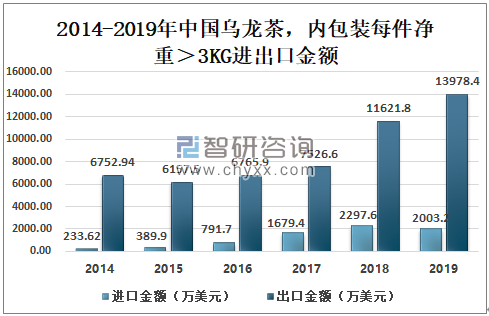 2018年中国内包装每件净重>3KG的乌龙茶进口金额为2297.6万美元,出口金额为11621.8万美元;2019年中国内包装每件净重>3KG的乌龙茶进口金额为2003.2万美元,出口金额为13978.4万美元。