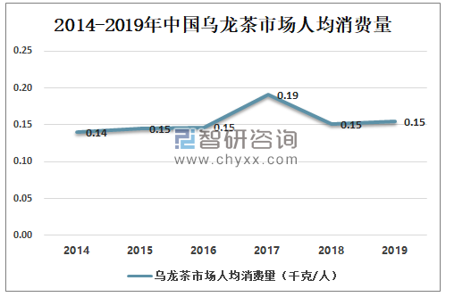 中国乌龙茶市场人均消费量波动幅度较大,2018年、2019年中国乌龙茶市场人均消费量均为0.15千克/人。