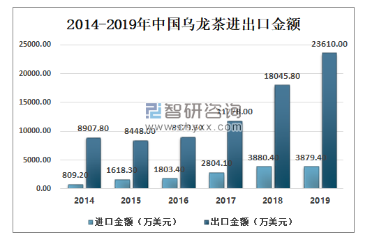 2015-2019年中国乌龙茶出口金额逐渐上升,2018年中国乌龙茶出口金额为18045.8万美元,2019年中国乌龙茶出口金额达到23610万美元;2018年中国乌龙茶进口金额为3880.4万美元,2019年中国乌龙茶进口金额为3879.4万美元。