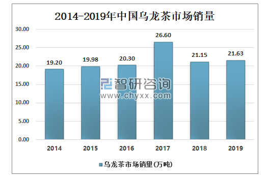 2014-2017年中国乌龙茶市场表观消费量呈上升走势,随后出现下降。2018年中国乌龙茶市场销量为21.15万吨;2019年乌龙茶市场销量为21.63吨。