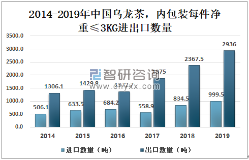 近年来中国内包装每件净重≤3KG的乌龙茶进出口数量都逐年增加,但出口量远大于进口量;2019年中国内包装每件净重≤3KG的乌龙茶进口量为999.5吨,出口量为2936吨。