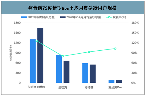 随着疫情得到有效控制,咖啡App用户月活显著回升,线上业务逐渐正常运转。主打外卖/自取的luckin coffee(即“瑞幸咖啡”,下同) 迅速恢复,用户体量达到历史最高,主打堂食的星巴克恢复缓慢。肯德基和麦当劳Pro成为疫情期间餐饮的重要选择,用户使用黏性稳中有升。