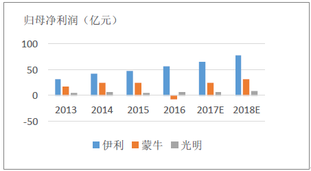2017 年前三季度伊利实现营业收入524.71 亿元,同比增长13.64%。归母净利润49.37 亿元,同比增长12.47%,实现基本每股收益0.81 元,净利率为9.41%,ROE达到20.71%。2017 年第四季度豆奶新品“植选”的问世,再次吸引了市场的眼球。预计明年整个豆奶行业达到100 亿规模,伊利的豆奶系列产品实现15 亿的收入。从整体来看,伊利营业收入超过蒙牛之后,二者差距逐渐拉开,2015 年伊利归母净利润已达到蒙牛的两倍,目前其营业收入是光明的三倍多,归母净利润达到光明的十几倍。从增速来看,伊利的营业收入和归母净利润增速虽然近年来受成本上扬影响有所趋缓,但从未经历过大起大落甚至是负增长。预计2017 年全年实现营业收入677.91亿元,归母净利润64.38 亿元。