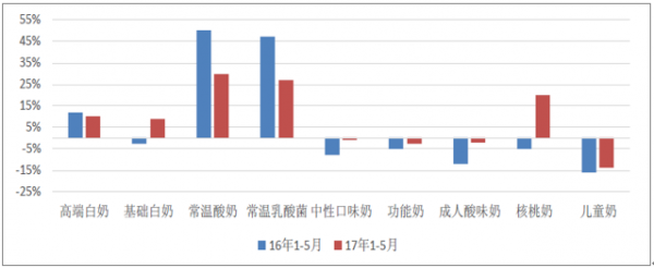 2016 年1-5 月及2017 年1-5 月乳制品行业各品类增速对比