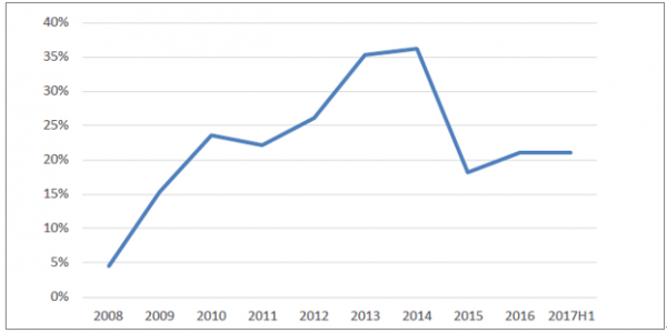 监管趋严倒逼乳企从原料到加工最后到销售全程注重自身产品的质量和安全。数据显示,2016 年,婴幼儿奶粉检测合格率为98.7%。横向来看,同期全国食品检测合格率为96.8%。从2008 年到2017 年上半年全脂奶粉进口量占全脂奶粉消费总量的比重经历了先波动上升后波动下降的过程,意味着消费者对国产奶粉的信心提升。2017年11 月首届婴幼儿配方奶粉论坛在石家庄召开,反映了国家和企业对奶粉行业的重视力度。在质量提升、政策支持的背景之下,国产奶粉会逐步挤占市场。