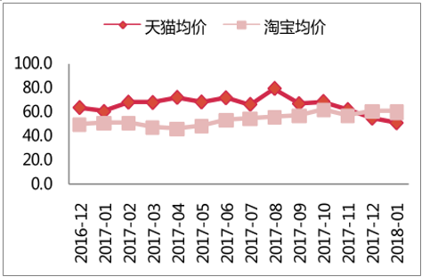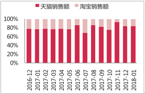 平台对比:天猫平台销售额份额 84%。纯牛奶行业同样表现出淘宝向天猫平台转换的趋势,2018年1月天猫销售额占全网销售额份额较去年同期提升 6.8pcts。均价方面,天猫平台均价约为淘宝的0.9倍。受主要品牌均价下调的影响,天猫被淘宝反超。