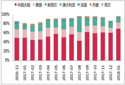 产地解析:国产份额提升,德/新/澳为主要进口国。从产地来看,国产纯牛奶份额从 2017 年1月的 50%提升至2018年1月的 69%。进口产品中,德国、新西兰、澳大利亚为最主要进口国。