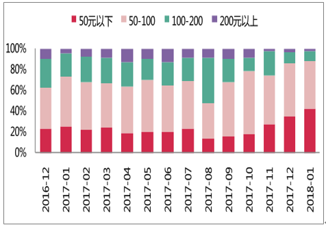 价格区间:整箱销售,50-100 为主力价格区间。 为主力价格区间。纯牛奶以整箱销售为主,主力价格区段为 50-100。 2017/1 至 2018/1 价格区间中枢下移,主要由于国产品牌逐渐挤占进口品牌空间。