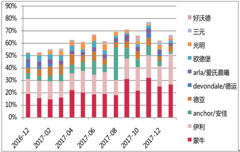 品牌份额:国内龙头持续收割进口品牌份额,国内龙头持续收割进口品牌份额,2018年 1 月蒙牛、伊利合计份额 月蒙牛、伊利合计份额超50%。2017/1至2018/1份额变动:蒙牛16%→26%,伊利 14%→25%,安佳3% →2% ,德亚6%→4%,爱氏晨曦4% →3%。