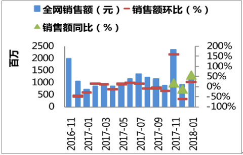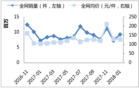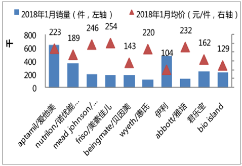 1月销售额11.7亿,旺季销售提升销量。2018年1月,奶粉母婴行业销售额11.7亿,1月销售额较去年同期+57.3%,1月增速上升主要受节前旺季销售影响。拆分量价来看,2018年 1月全网销量上涨 28.1%;均价上涨+22.4%。