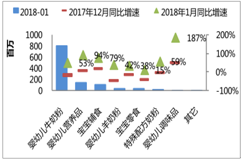 品类解析:婴幼儿营养品快速增长,辅食、羊奶、零食多样化发展。从体量看,牛奶粉仍为最大品类,18 年1月销售额占比 69%。从增速看,各品类在1月春节前旺季均有提升,其中婴幼儿牛奶粉(1月同比+53%)、营养品(1 月同比+94%)、辅食(1月同比+79%)高速增长增长。婴幼儿食品多样化、健康化趋势明显。