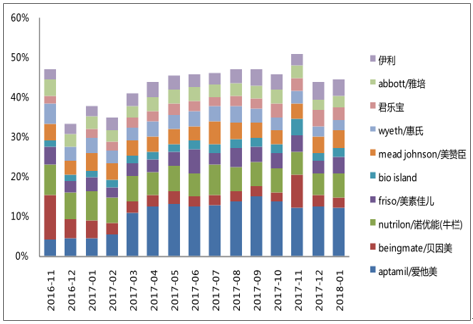 品牌份额:爱他美取代贝因美成为龙头,伊利、君乐宝追赶,前十大品牌集中度增长。2017/1 至2018/1各品牌份额变动:爱他美4%→12%,伊利2.7%→4.4%,君乐宝2%→3%;贝因美5%→2%。