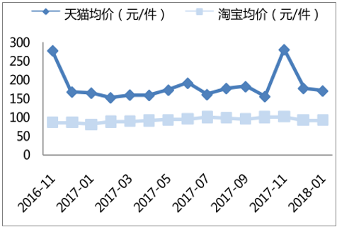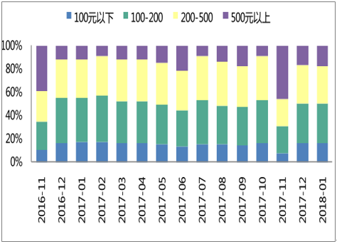 价格区间:200元以上占比攀升显现高端化趋势,旺季囤货影响显著。2017/1至2018/1各价格区间份额变动:100元以下 17% →17%,100-200元38% →34%,200-500元33%→32%,500元以上11%→17%。中低端产品比重下降,大额订单比重增长。