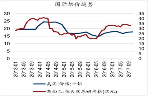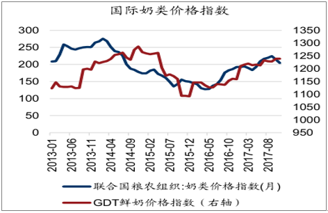 据数据,全球奶牛数量近年来呈下滑趋势,牛奶产量存在一定的收缩预期。从国外主要乳品价格指数来看,GDT鲜奶价格指数在年中回升后出现拐头向下迹象,国际粮农组织奶类价格指数年初以来持续温和上涨,恒天然宣布下调 2017/2018 年度收奶价格,并下调产季收奶量,中国奶粉注册制可能对此存在一定的影响。综合 GDT 价格指数、国际粮农组织奶类价格指数、恒天然原奶价格、美国牛奶价格来看,国际奶价总体仍处在上升周期,明年原奶价格仍存在温和上涨预期,有望带动国内奶价回暖。从国内下游厂商情况看,乳企近期营销力度趋缓,销售费用有所下降,龙头企业又能进一步将成本端上行压力向下传导,从而改善企业业绩。同时,奶价上行也将对上游原奶生产企业以及业绩弹性较大、拥有自建牧场、转价能力较强的龙头企业形成利好。