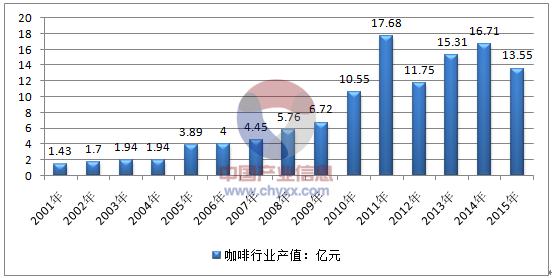 据云南省农业科学院测算,2001年我国咖啡行业产值仅为1.43亿元,2011年在国内咖啡产量及产品均价大幅上扬的推动下,我国咖啡产业产值上升至17.68亿元,创下历史新高,2012年以来虽然国内产品产量呈快速上涨趋势,但是产品价格的快速回落导致2012年行业产值仅为11.75亿元,2013年行业产值为15.31亿元。2014年达到了16.71亿元。2015年受到全球咖啡价格走低,国内咖啡产值下降,约13.55亿元。