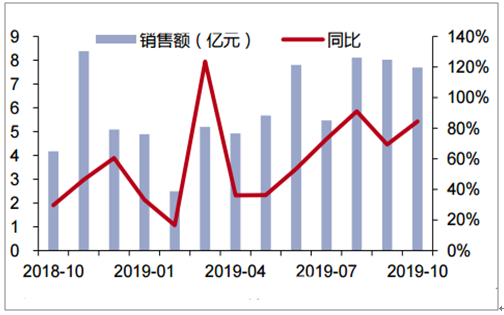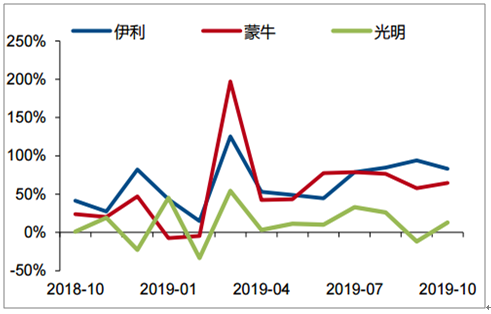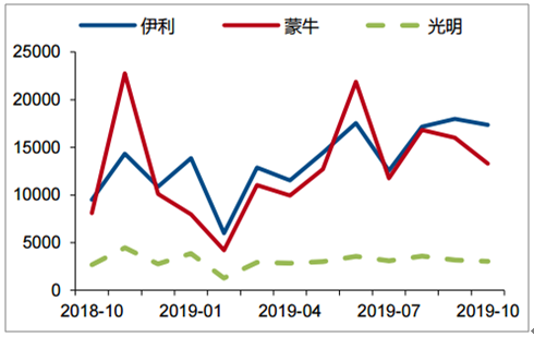 伊利保持快速增长,线上份额持续领先。2019年10月阿里渠道伊利销售额为1.74亿元,同比增长82.93%,销量276.73万件,同比增长59.86%,均价62.73元,同比增长14.43%。10月阿里渠道蒙牛销售额为1.33亿元,同比增长64.46%,销量232.67万件,同比增长56.42%,均价57.17元,同比增长5.14%。2019年10月光明销售额3041.00万元,同比增长13.00%,销量49.46万件,同比增长23.81%,均价61.49元,同比下降8.73%。伊利10月线上份额为21.64%,同比下降1.10pcts,蒙牛10月线上份额为16.59%,同比下降2.80pcts。