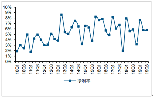 2019年前三季度乳制品行业净利率6%,同比下降0.05pct,其中2019Q1/Q2/Q3行业净利率分别为8%/6%/6%,分别同比变动-0.33pct/0.21pct/-0.11pct。