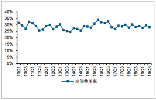 2019年前三季度乳制品行业费用率29%,同比下降0.05pct,其中2019Q1/Q2/Q3行业费用率分别为28%/30%/28%,分别同比变动-0.21pct/-0.65pct/-0.28pct。
