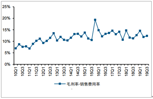 2019Q1/Q2/Q3行业毛销差分别为15%/12%/12%,Q2和Q3分别较去年同期提升0.3%和1.1%,前三季度龙头伊利的毛销差同比提升1.02pct至14.2%,继续引领行业盈利能力的提升。