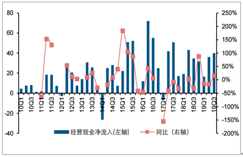 2019年Q3乳制品行业经营性现金流净额为39.74亿元,同比增加15.56%,其中流入411.71亿元,同比增加8.34%,流出371.96亿元,同比增加7.62%。