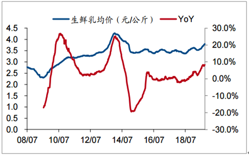 成本上涨,竞争保持,龙头份额加速上升。2019年成本端温和上涨,竞争保持,行业龙头继续借助品牌及渠道渗透优势抢占中小地方性品牌份额趋势不变,份额加速集中。1)成本端:原奶供需偏紧支撑奶价上行,2019年前三季度原奶价格同比+7%,预计2019年全年涨幅约6%,2020年原奶仍处于上涨周期。原奶价格上行虽然给成本端带来压力,但龙头凭借与产业链上游原奶的紧密合作、不断优化产品结构及规模效应等,实现盈利能力及份额进一步提升;2)费用端:目前行业进入中后期整合阶段,在行业缓慢增长下,各细分品类竞争均在加剧,2019年市场促销相较去年没有明显放缓,龙头加大促销力度争夺份额。