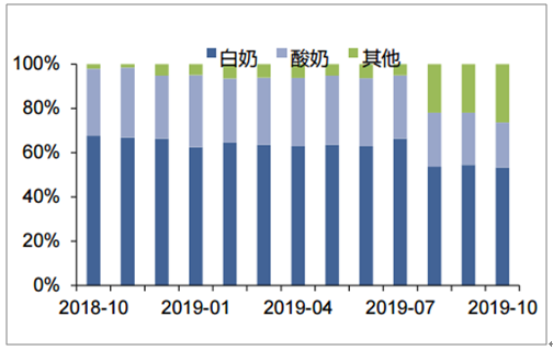 线上销售延续高增,白奶表现较好。10月行业销售额7.69亿元,同比增长84.44%,销售量1356.84万件,同比增长84.80%,平均产品价格56.71元,同比下降0.19%。分子品类来看,白奶占比53.09%,同比下降14.58pcts,酸奶占比20.44%,同比下降9.79pcts。其中10月白奶销售额为4.09亿元,同比增长44.71%,均价69.14元,同比增长11.46%;10月酸奶销售额1.57亿元,同比增长24.69%,均价53.60元,同比增长4.60%。