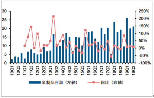 2019前三季度乳制品收入端继续维持稳健增长,收入增速季度之间略有波动,但是需求相对稳定,预计全年维持稳健;前三季度行业竞争依旧保持相对激烈,在原奶价格上涨的背景下,行业盈利增长继续保持双位数,我们认为在成本上涨背景下,公司可以通过产品结构升级转嫁部分成本压力,同时上游原奶供需偏也会中期有利于乳制品行业的竞争格局改善。