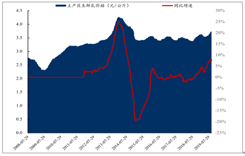 2019年1-7月全球五大主要原奶出口国合计原奶产量同比-0.2%,GDT全脂乳粉今年以来价格上涨17.46%。国内方面,受2018年底牧场减少、奶牛存栏量下滑影响,国内22个主产区生鲜乳价格2019年以来上涨3.2%,其中Q3呈季节性加速上涨。