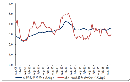 国内原奶自给率呈下降趋势,国内与国际原奶价格保持高度联动。从2010年开始,随着贸易开放程度提高,国内原奶自给率呈下降趋势,主要系受饲料价差影响,国内养殖成本较高,且受近两年环保政策加剧,部分小牧场被迫出清,预计短期国内原奶供给量保持低个位数增长,因而进口原奶的替代需求提升(近2年占比约在15-20%的区间波动)。目前进口奶粉还原奶含税价在3.65元/kg,与国内生鲜乳价差已被抹平,未来两者的联动预计增强。预计短期国际奶价走势传导至国内将是温和抬升的态势,全年预计涨幅在5-10%区间。