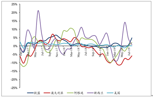 2018/19产季原奶产量同比-5.7%,达88亿升,低于早前预期7-9%降幅区间,主要系澳大利亚6月降水量恢复所致。截至2019年7月,澳大利亚原奶产量同比-8.4%,预计澳大利亚下一季度原奶将维持减势,同比降幅预计为3-5%,总产量降至83-85亿升。