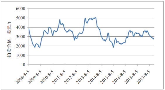 2008-2018年全球乳制品拍卖平均中标价格变化