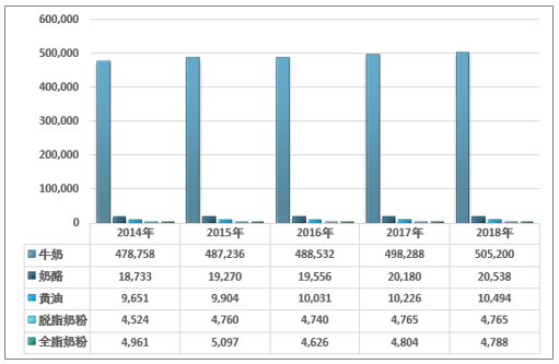 2018年全球牛奶产量50520.0万吨,奶酪产量2053.8万吨,黄油产量1049.4万吨,脱脂奶粉产量476.5万吨,全脂奶粉产量478.8万吨。