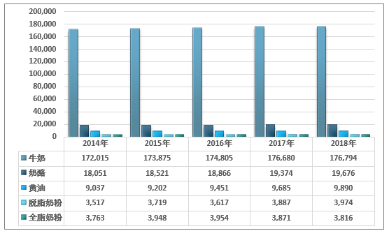 | 年份 | 脱脂奶粉 | 全脂奶粉 | 奶酪 | 液态奶 | 黄油 | 合计 |