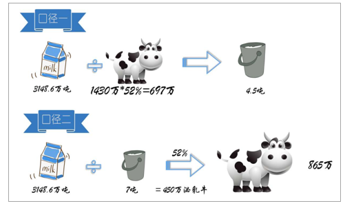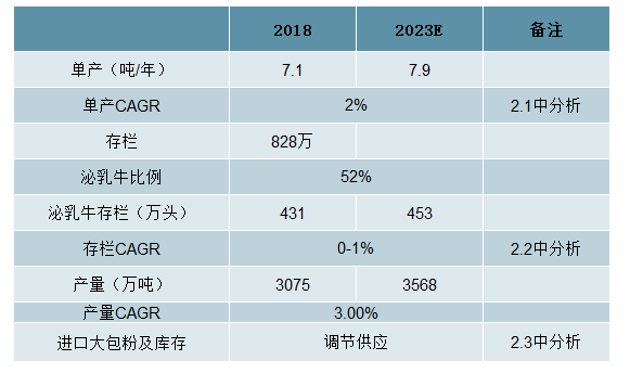 过去几年,行业单产水平的提升速度大致是每年3%以上,未来几年,增速或有所放缓的趋势,但对比国际水平或国内先进水平(如现代牧业),我国行业单产仍有较大的提升空间,因此假设每年单产的提升2%较为合理。