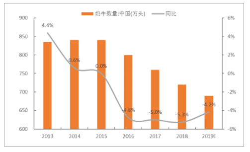 奶价低迷叠加环保去产能,奶牛存栏连续3年下滑。2015年以来,生鲜乳价格持续处于低位,使得全行业盈利水平出现恶化,大中型牧场扩栏意愿减弱&小型牧场持续退出推动全国奶牛存栏持续下滑。2018年中央加大环保督查力度,诸多牧场因环保不达标而关停,奶牛存栏进一步下滑。