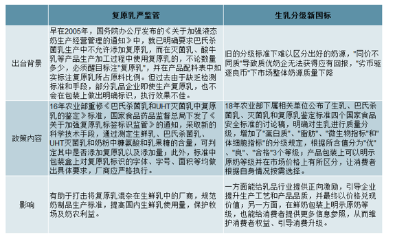 受低价进口大包粉的影响,一些奶制品加工企业在选择原奶时更多地用大包粉替代生鲜乳,导致国内牧场生鲜乳供应受到阻力,打击了其生产原奶甚至优质奶的积极性。为了提升鲜奶使用量,改善国内牧场生存环境,促进乳业健康发展,监管层陆续出台了相关政策,如“复原乳严监管”、“生乳分级新标准”,严格规范下游乳制品企业生产行为,鼓励使用生鲜乳生产灭菌乳、发酵乳、调制乳和婴配粉等乳制品。