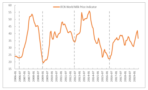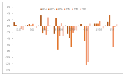 全球原奶的主要产地为欧盟、美国、印度、中国、俄罗斯,产量合计占全球的70%以上,主要出口国为新西兰、欧盟、美国,合计出口量占全球约70%。预测19年主要出口国新西兰、欧盟、美国、澳大利亚奶牛存栏同比+0.14%、-1.33%、-0.63%、-3.28%,主要进口国俄罗斯、中国、墨西哥、巴西奶牛存栏同比-1.43%、0.81%、-0.76%、0.52%。考虑奶牛形成产能需要2年左右时间,而短期内奶牛单产稳定,全球原奶产能或难以扩张。