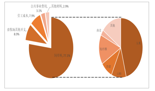 行业已基本实现规模化养殖:08年以前,散户奶农为原奶供给主力军,三聚氰胺事件后,政府和下游乳企携手推动上游养殖规模化,大量散户退出市场。目前看,我们考虑中国实际奶牛存栏远低于官方数据,认为奶牛养殖规模化程度或已高达90%以上。奶牛养殖成本构成:从国内最大奶牛养殖企业现代牧业的成本明细结构看,饲料成本占到总成本的77%,其中玉米、豆粕、苜蓿为占比居前的三类饲料。