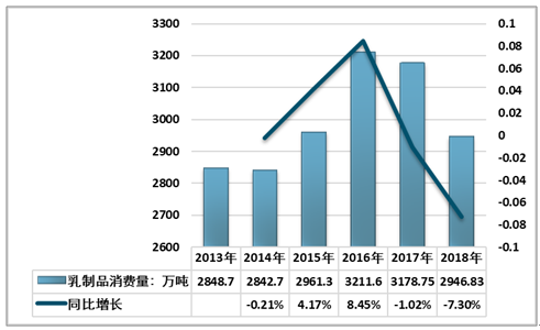 2013-2018年中国乳制品消费量及增速统计
