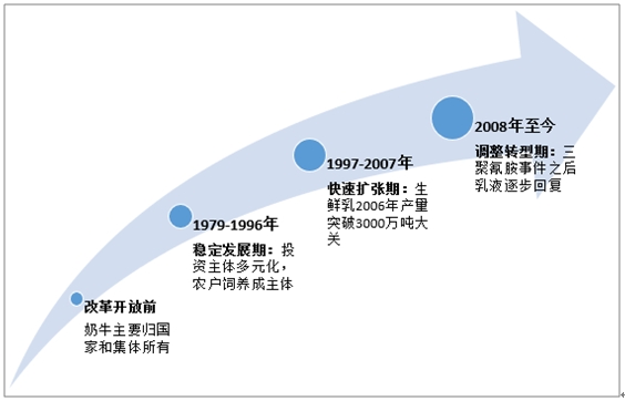 中国乳制品行业起步晚、起点低,改革开放前处于较为缓慢的发展时期。1997年以前稳定发展,从 1997 年开始进入高速增长阶段,发展迅速。直到 2008 年爆发的“三聚氰胺”事件对乳品行业带来了致命打击,不少乳品企业的生产近乎陷入停滞状态,整个行业的总产量也因此而出现了负增长。由于国家对乳品行业的整顿及企业对安全生产意识的强化,中国乳品行业进入复苏期,行业产量、产值和销售收入均呈现缓慢平稳回升态势,国内乳制品消费市场开始回暖,消费逐步趋于理性。