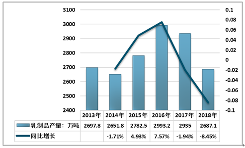 2017年至今,我国乳制品产量开始下滑,2018年我国乳制品行业市场产量约2687.1万吨,相比2017年下降了8.45%。