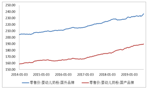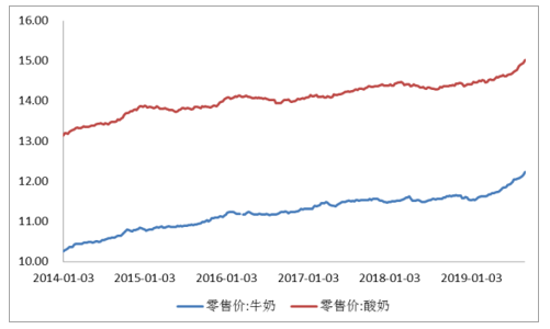 牛奶、酸奶及婴幼儿奶粉价格长期呈现缓慢上涨趋势。8月牛奶平均价格为12.14元/升,同比上涨4.89%;酸奶平均价格为14.93元/升,同比上涨4.22%。2019年8月国产品牌婴幼儿奶粉零售价达到189.34元/升,同比上涨4.55%;国外品牌婴幼儿奶粉零售价达到227.42元/升,同比上涨3.47%。