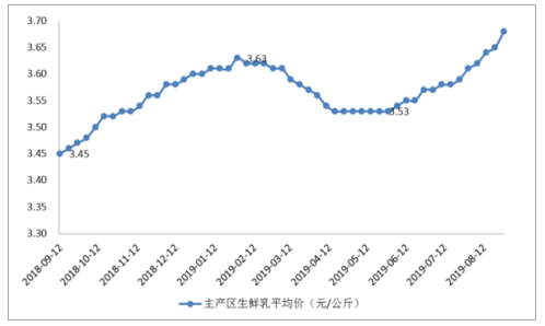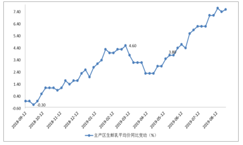 生鲜乳价格小幅上扬,整体呈现平稳趋势。7月份生鲜乳平均价格达到3.59元/公升,同比上升6.32%。
