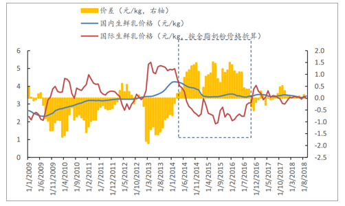人民币贬值,进口大包粉还原价格与国内生鲜乳价格接近。2013年受A型口蹄疫影响,加上夏季罕见高温现象,奶牛存栏出现负增长,生鲜乳产量也严重下滑,奶荒背景下大包粉进口占比提升。2014年国际奶价大幅下跌,进口大包粉对生鲜乳替代存在明显价格优势。而目前来看,受16年以来,国际奶价的复苏走强,及今年以来持续的人民币贬值影响,目前国内外价差已相当接近,在短时间内,大包粉不存在替代的价格优势,国内外奶价预计联动性亦将随之增强。