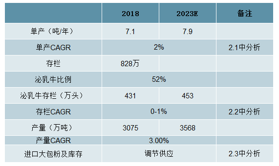 过去几年,行业单产水平的提升速度大致是每年3%以上,未来几年,增速或有所放缓的趋势,但对比国际水平或国内先进水平(如现代牧业),我国行业单产仍有较大的提升空间,因此假设每年单产的提升2%较为合理。