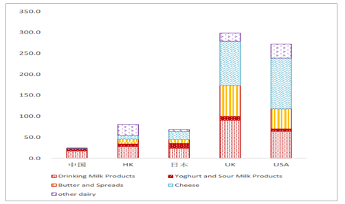 人均乳制品消费国内外对比(单位:kg/人/年)